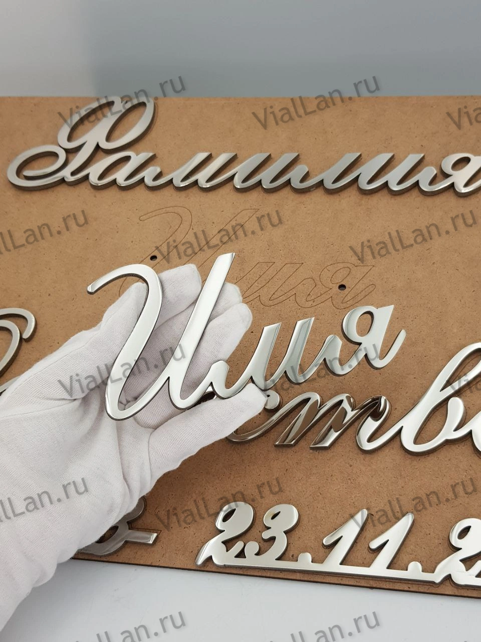 Лазерная резка позволяет создавать изящные курсивные шрифты и целые фразы прописью.