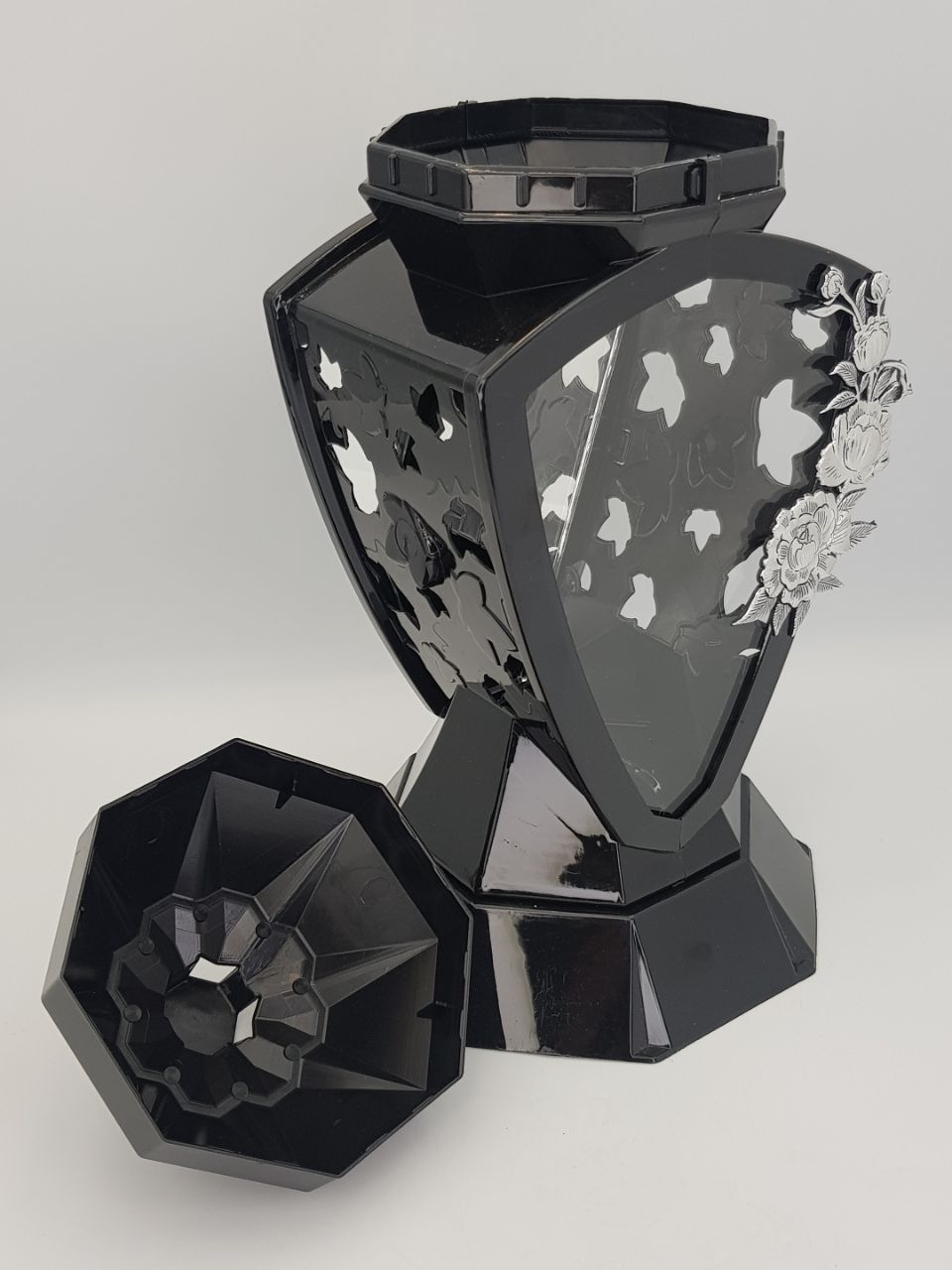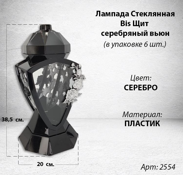 —Лампада стеклянная Щит серебряный вьюн Bis (размер 38,5*20*20 см, корпус трапецевидный, колба плоское прозрачное стекло, пластик черный, цветы вьюн серебро, в упаковке 6 шт.) арт:2554
