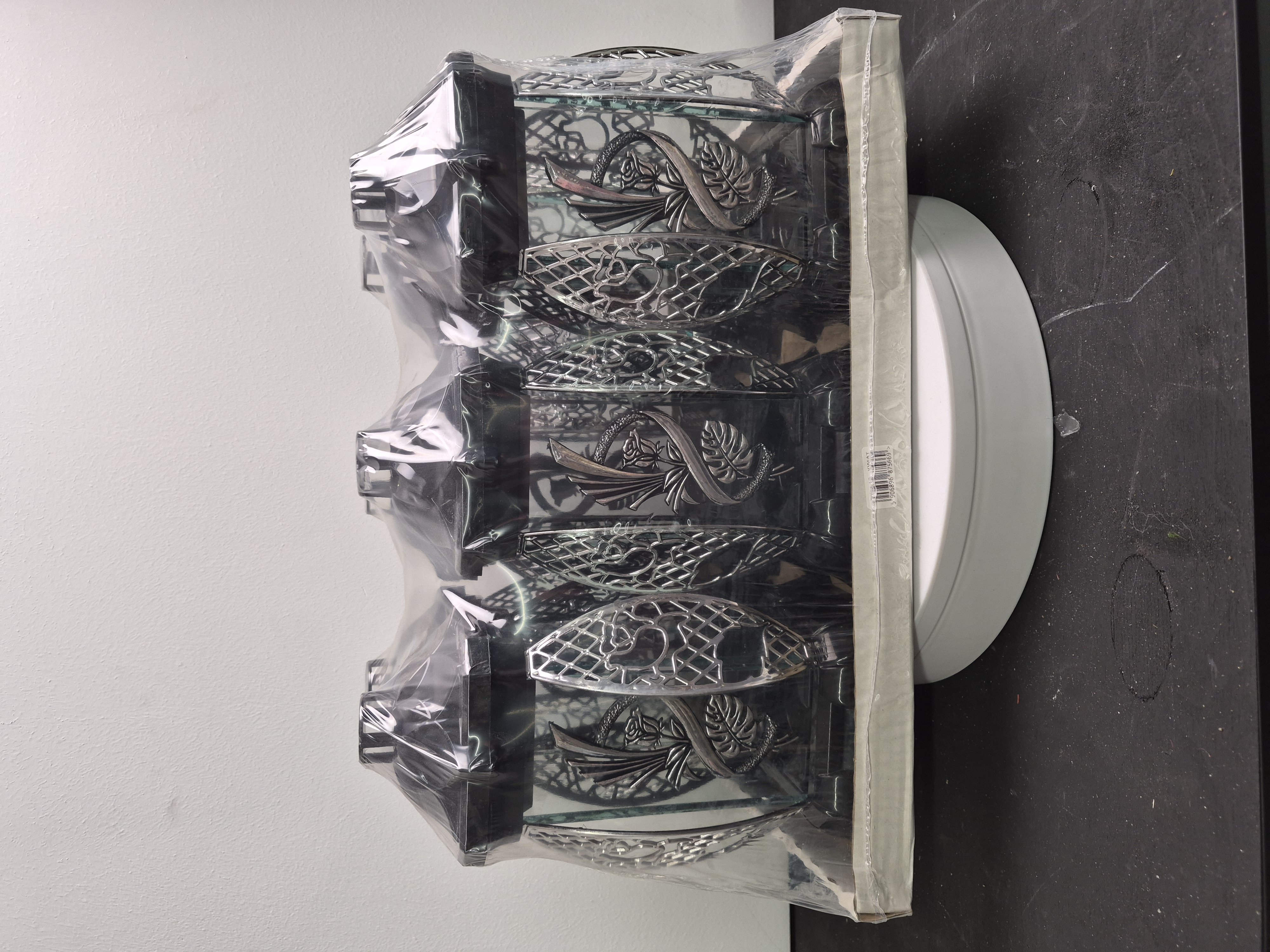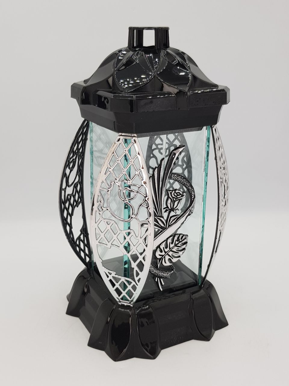 Лампада стеклянная Роза Монстера серебро KWIAT (размер 26х12х12, корпус прямоугольный, колба плоское прозрачное стекло, пластик черный, Роза монстера серебро, в упаковке 6 шт.) арт:2525
