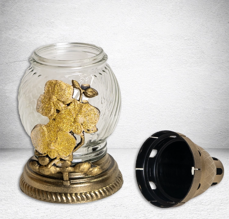 Лампада стеклянная Цветок Блестки (размер 20х10, корпус шаровидный, колба прозрачное стекло, пластик бронза, Цветок золото блестки, в упаковке 6 шт.) арт:2512
