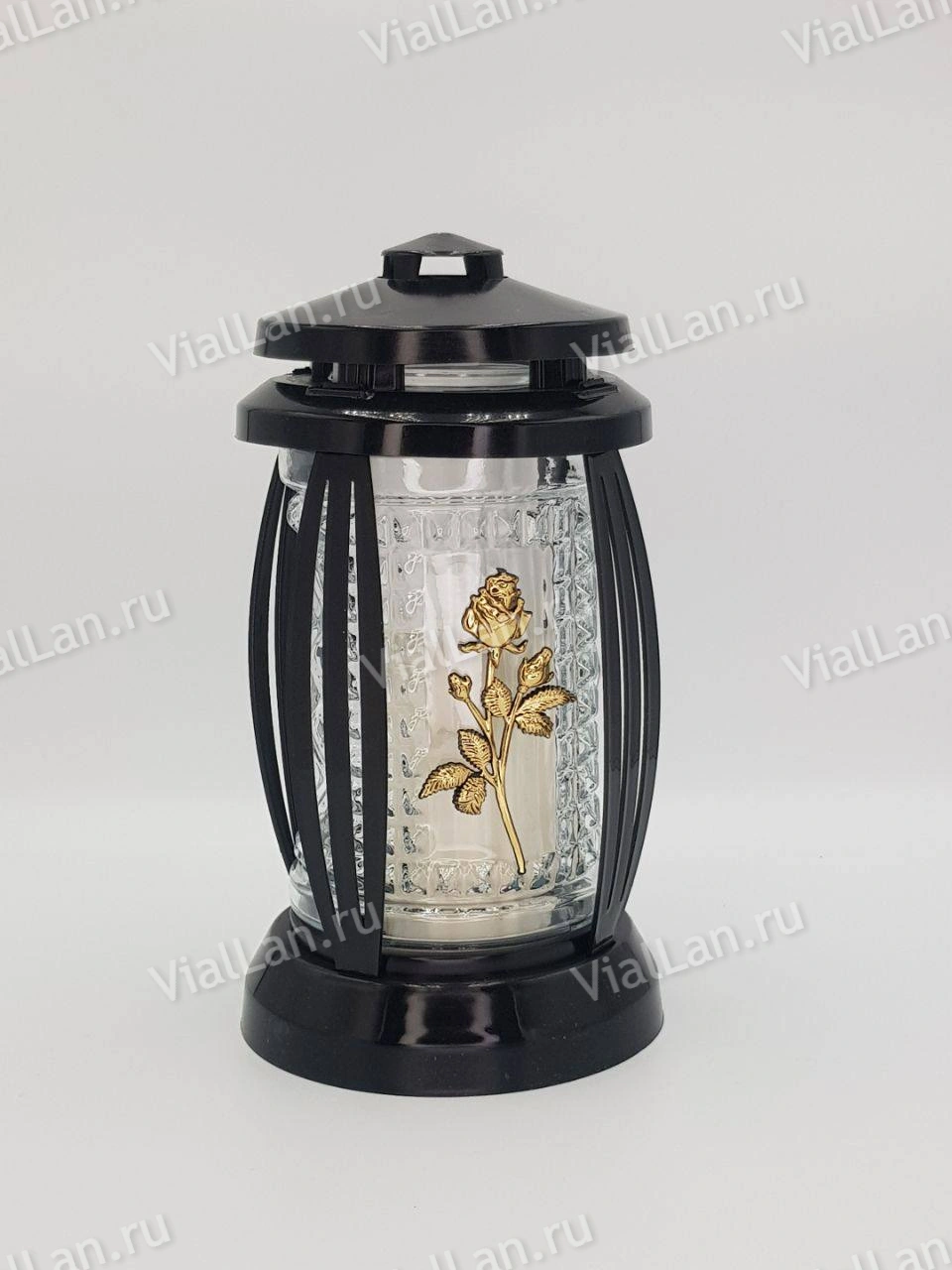—Лампада стеклянная Prima 1 (25*13*13, корпус прямоугольный, колба прозрачное стекло, пластик черный, роза с бутонами золото, в упаковке 6 штук) арт:1852
