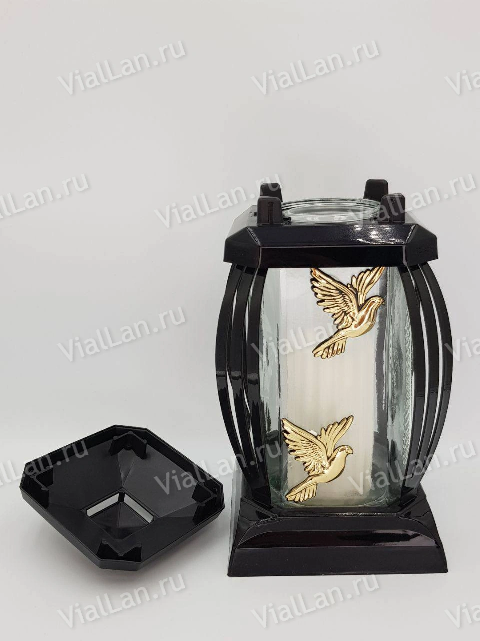 +Лампада стеклянная Голуби Prima 10 (25*12*12, корпус прямоугольный, колба прозрачное стекло, пластик черный, Голубь х2 золото, в упаковке 6 шт.) арт:1926