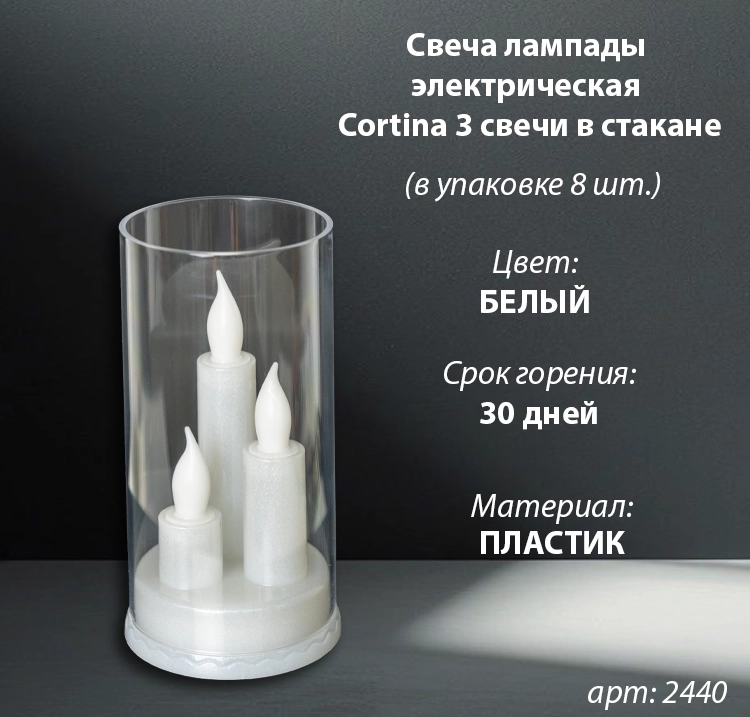 Свеча лампады электрическая Cortina 3 свечи в стакане (Цвет белый, в упаковке 8 шт.) арт:2440