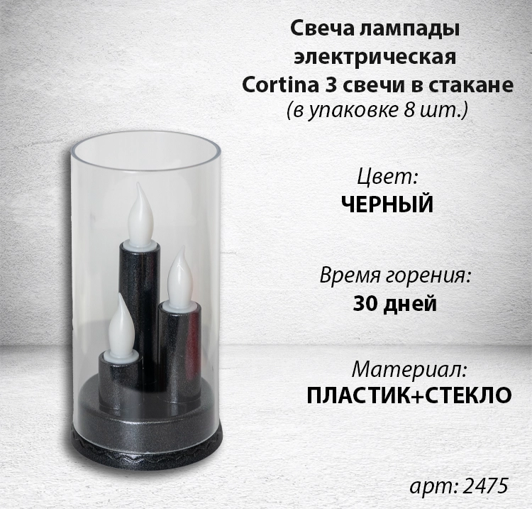 —Свеча лампады электрическая Cortina 3 свечи в стакане (Цвет черный, в упаковке 8 шт.) арт:2475